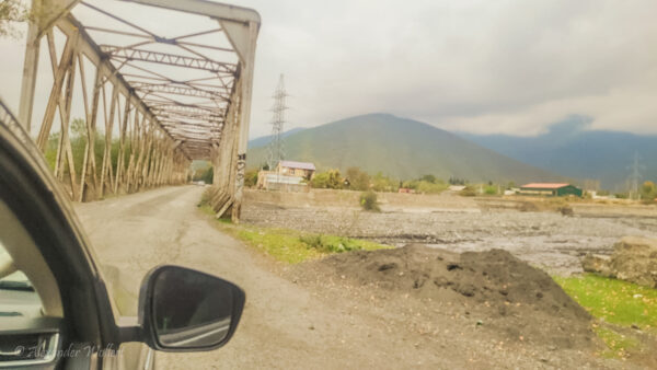 Durch einen Wald kommen wir an den Rand eines riesigen trockenen Flussbettes. Darüber führt nur eine enge, kaputte Brücke und einen Teil müssen wir durch das Flussbett selbst fahren, weil ein Teil der Brücke eingestürzt ist.