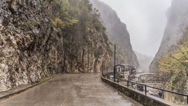 Nicht weit weg von hier finden wir auf der Karte den Wasserfall von Afurca und beschließen diesen zum Höhepunkt des Tages zu machen. Dafür müssen wir weiter das Tal entlang und dann den Hang zum gleichnamigen Dorf hinauf fahren. Ich möchte die Gelegenheit nutzen, um etwas zu wandern, und stelle den Wagen im Dorf ab. Der Weg zum Wasserfall wäre unter normalen Umständen auch ein Spaziergang gewesen, aber der Regen hat die Straße in eine Schlammpiste verwandelt.