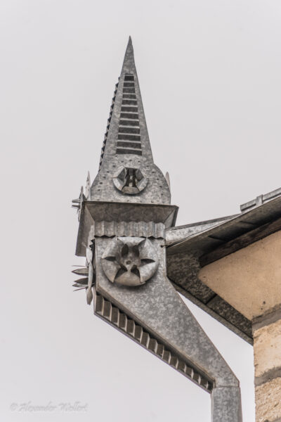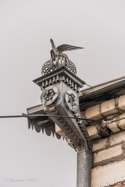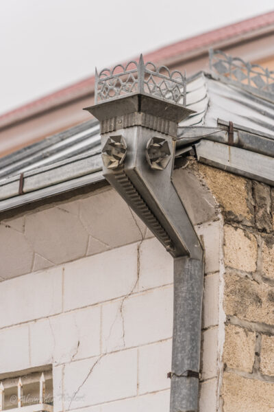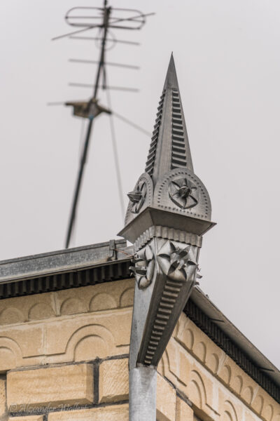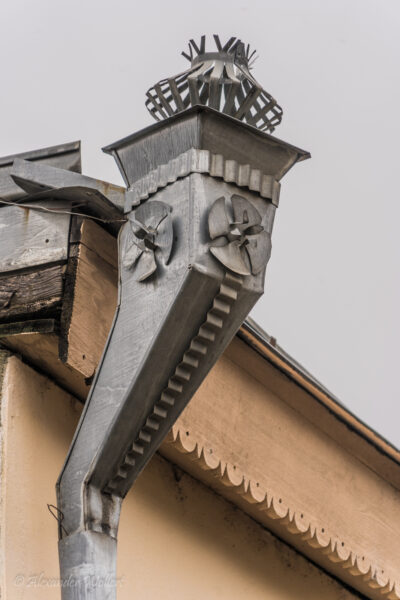 Uns fallen die besonderen Regenrinnen auf. Aus Aluminium wurden kleine Türmchen gebaut, welche Gebäude rundherum schmücken.