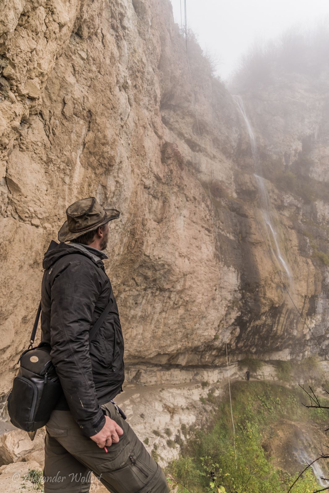 Es ist sehr rutschig und wir müssen um unseren Halt kämpfen. Andererseits klebt der Schlamm an unseren Schuhen wie Zement. Es ist ein unerwartet harter Weg bis zum Wasserfall. Dafür ist dieser beeindruckender als erwartet. Er ist sehr hoch und bildet die Bühne für ein Amphitheater der Natur. Wenn es nicht bewölkt wäre könnten wir von dem Weg hinter dem Wasserfall sehr weit sehen.
