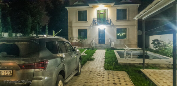 Es ist eine lange Fahrt und wir beschließen in der Stadt Gabala (Qəbələ) zu übernachten. Online finden wir eine riesige Villa mit Pool für einen lächerlichen Preis. Es ist zwar zu kalt für den Pool, aber das Haus ist einfach riesig. Jeder von uns kann gleich sein eigenes Stockwerk haben.