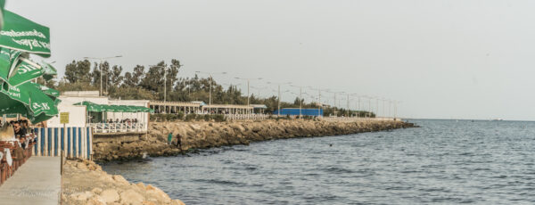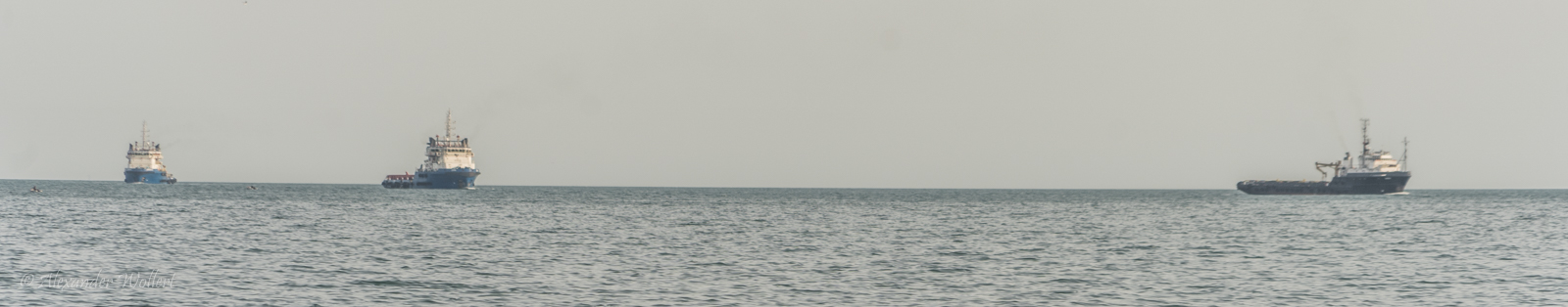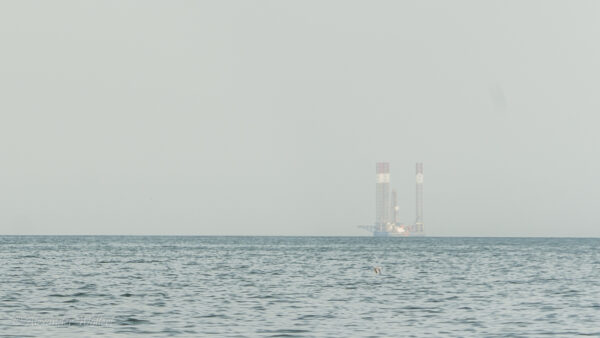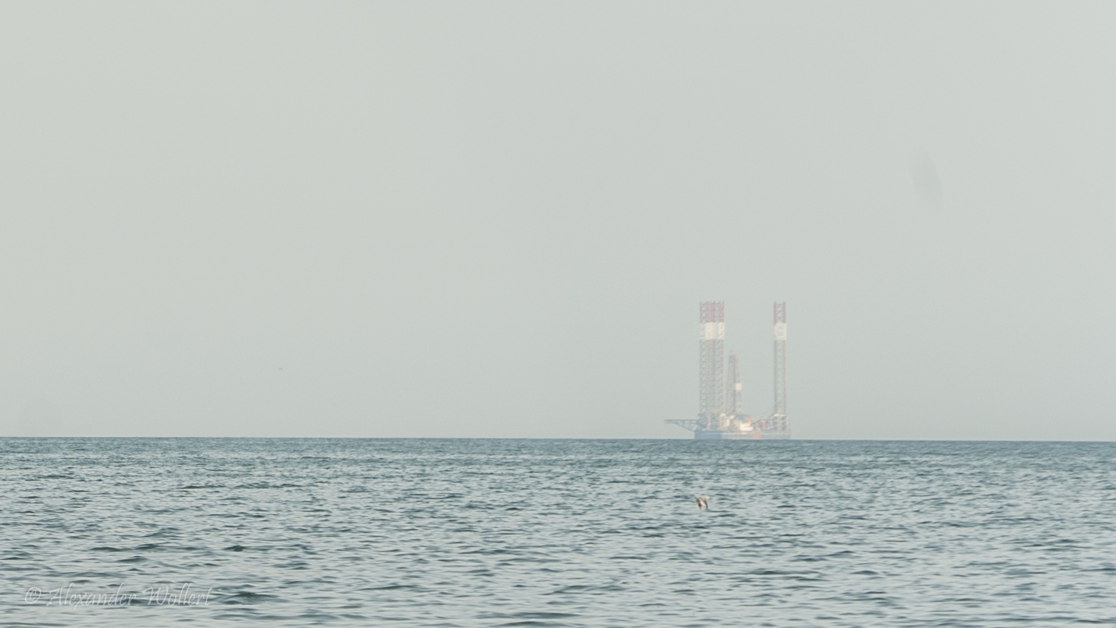 Then we find our way to the water. We sneak into a beach restaurant and see the sea, the oil rigs, and the oil tankers.