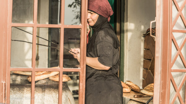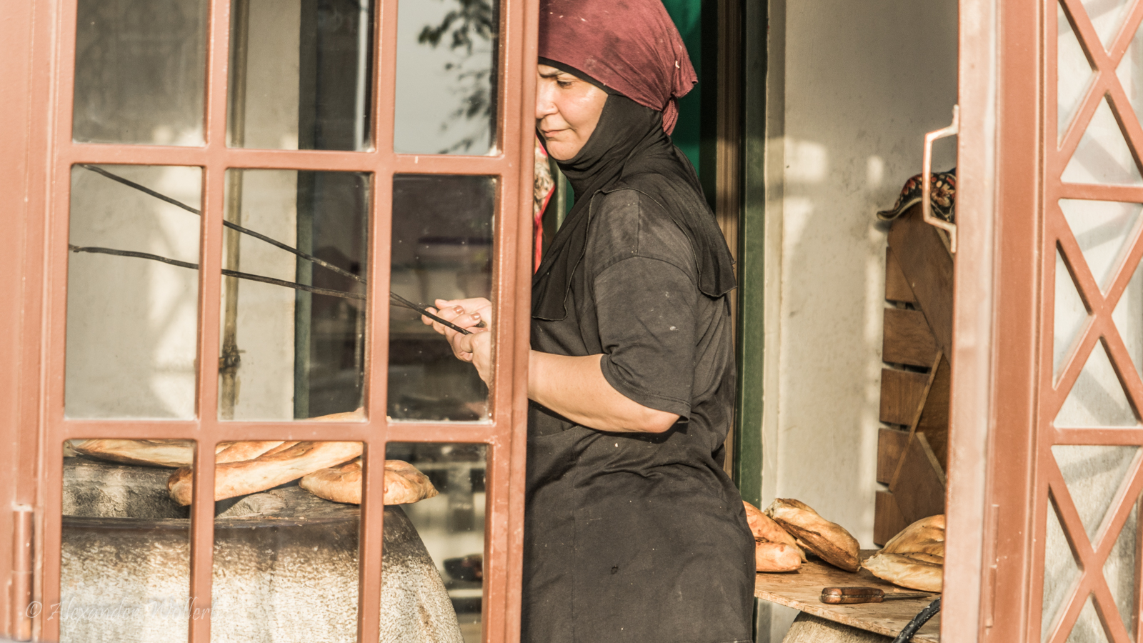 Elvi cheerfully points out a small bakery to us. We head towards it and watch a woman baking bread.