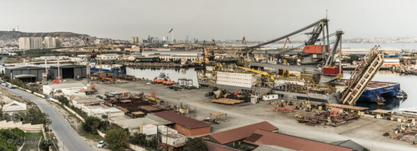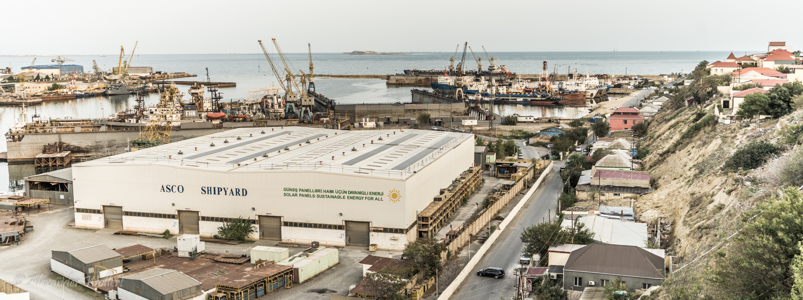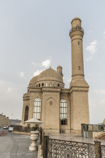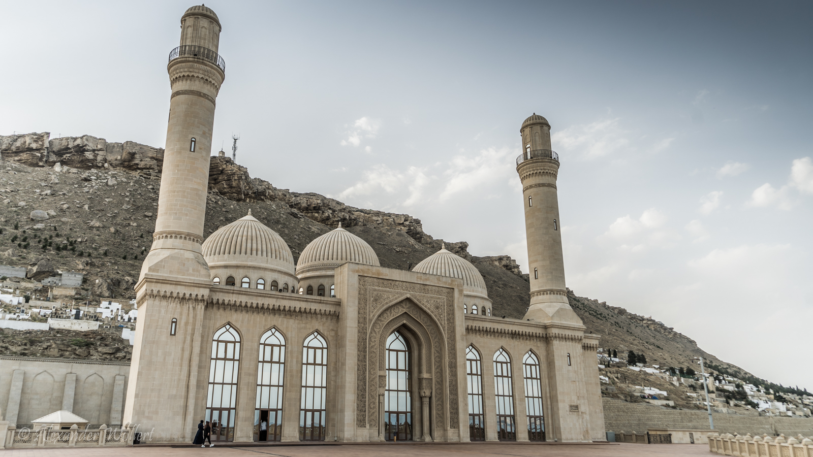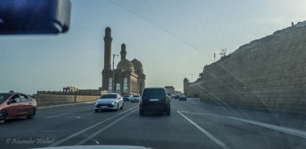Finally, we find our way back to the Bibi-Heybat Mosque, which we had previously passed on our left. From the building, we have a view of the Caspian Sea and the gas exploration vessel port.