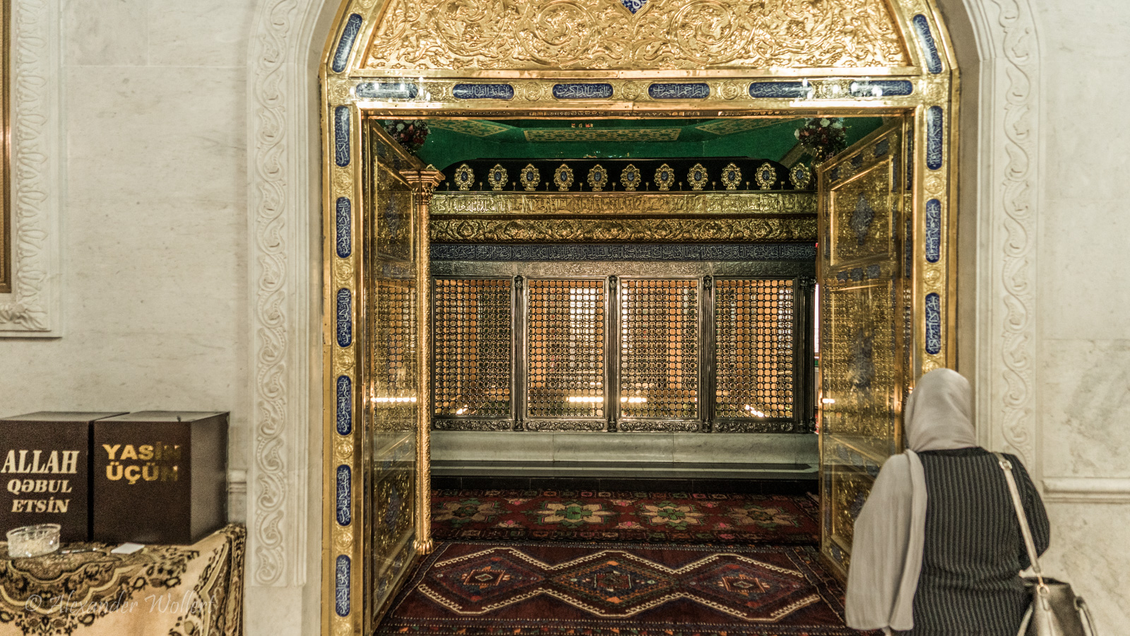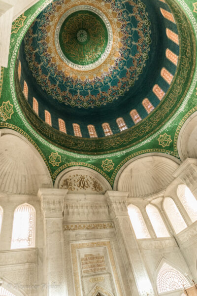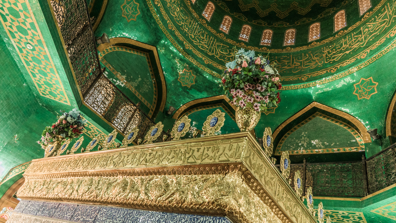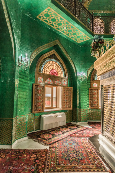 Even the worshippers at prayer don’t seem bothered by our presence. Inside the mosque, we find a shrine decorated in gold and green, as well as a beautifully painted dome.