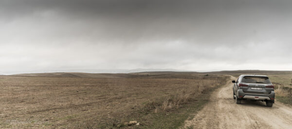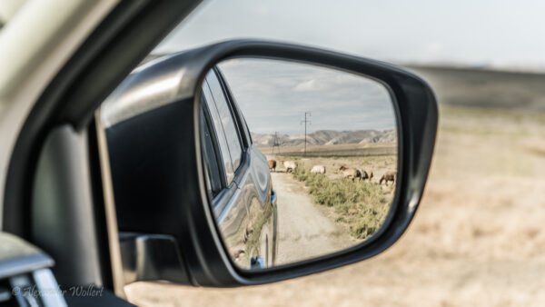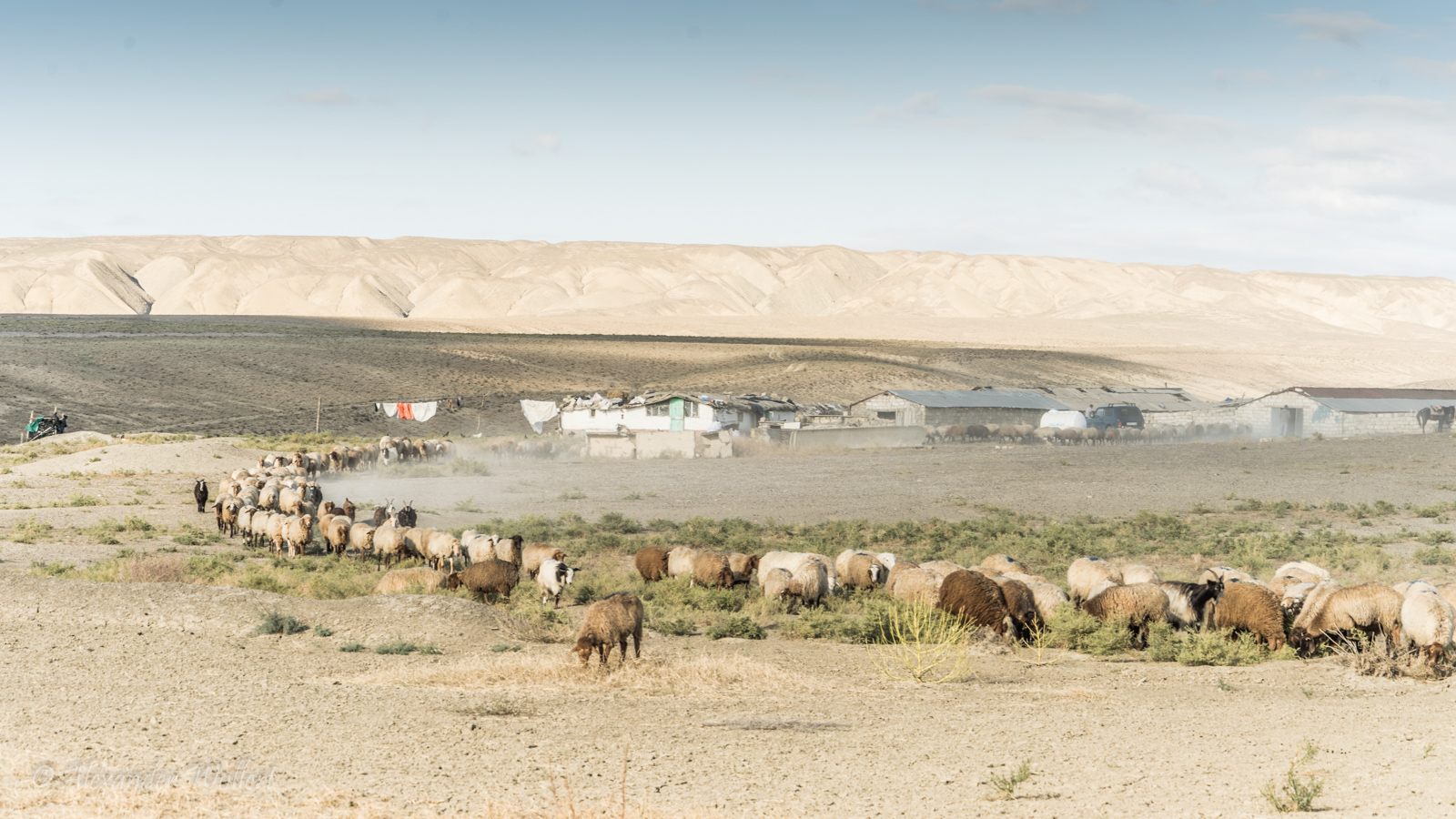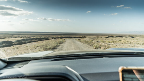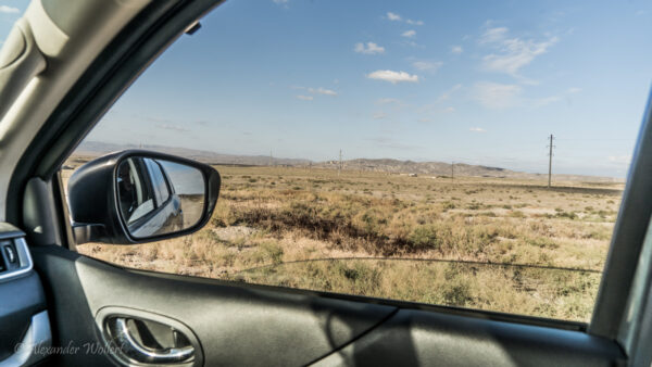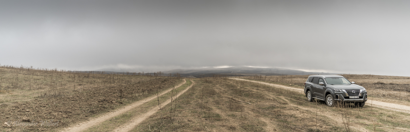 We drove past the police officers again (who now seemed to have given up on us) and back onto the main road, taking a detour around the national park via the motorway to find a road into the mountains. While the past few days had been sunny, today it was relatively cloudy. It only started to clear up in the afternoon when we reached the gravel track towards the mountains behind the small town of Mughan.