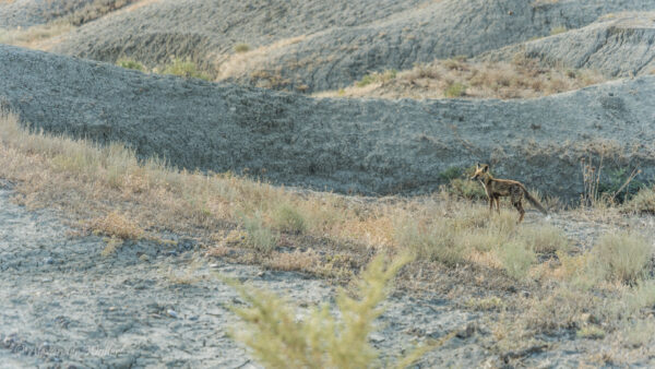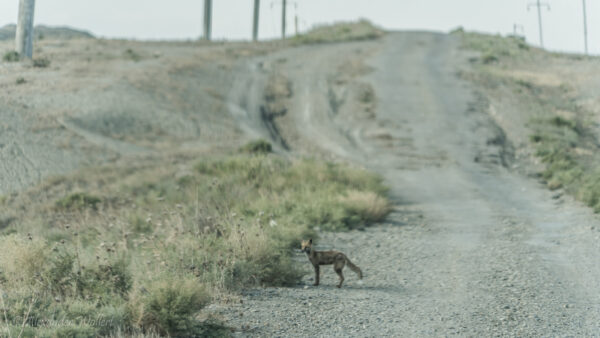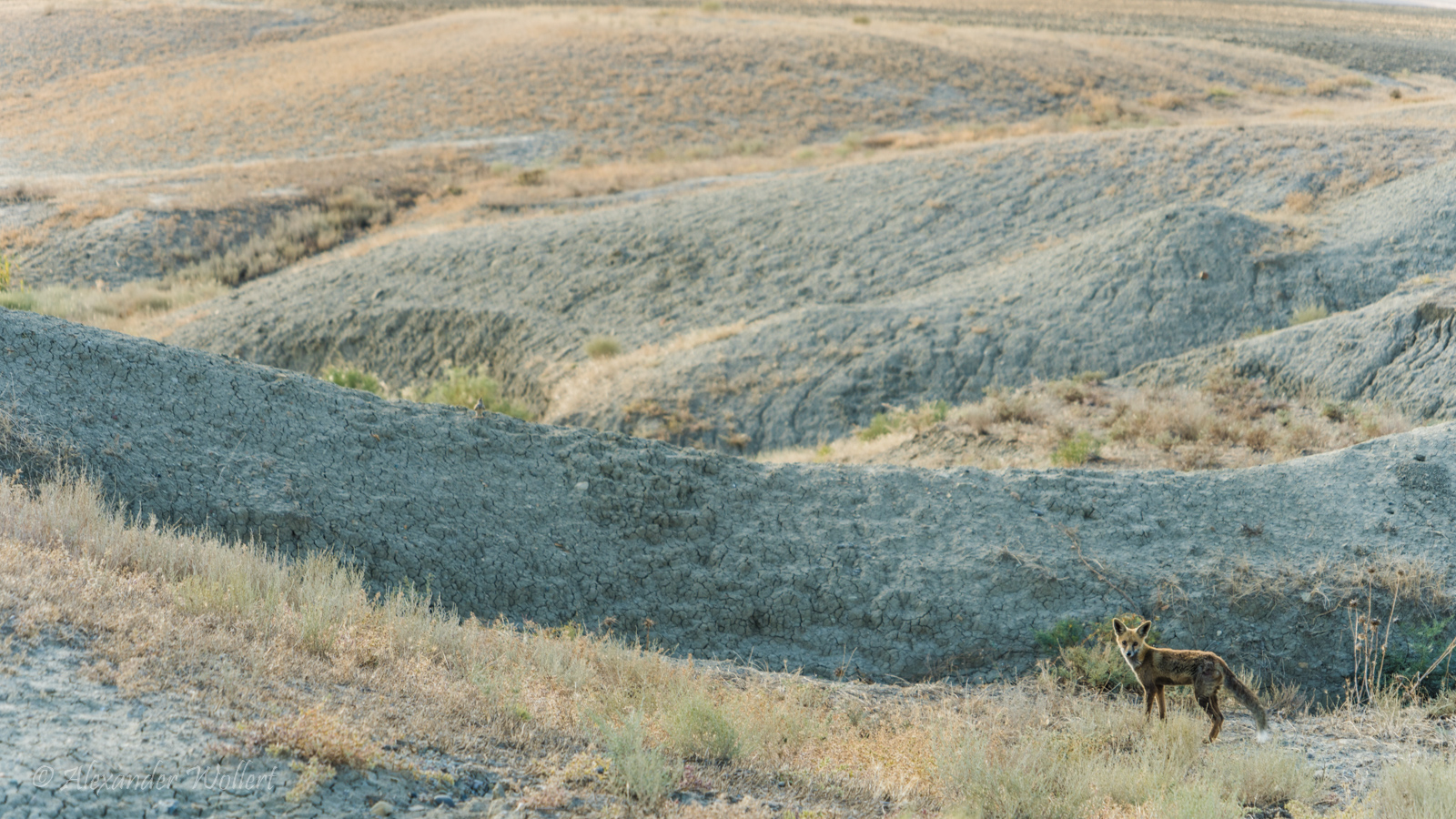 The sun slowly sets and the light gradually dims. A small fox looks at us from a short distance in curiosity.