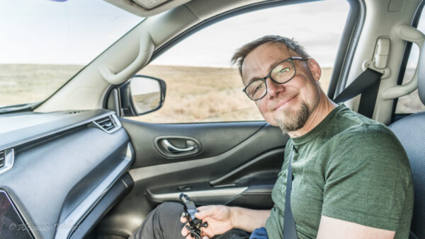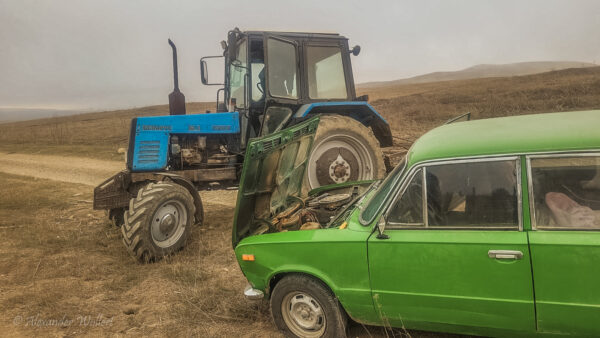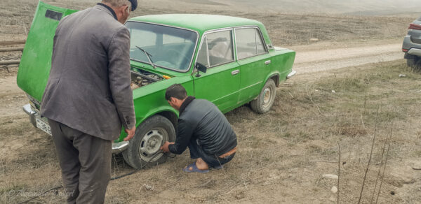 He bridges one of his tires with the Lada’s and pumps it up again. It probably won’t hold for long, but the old man cheerfully bids farewell to the lad and us and chugs on happily.