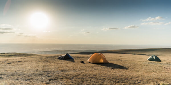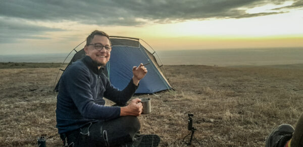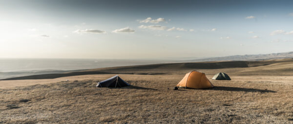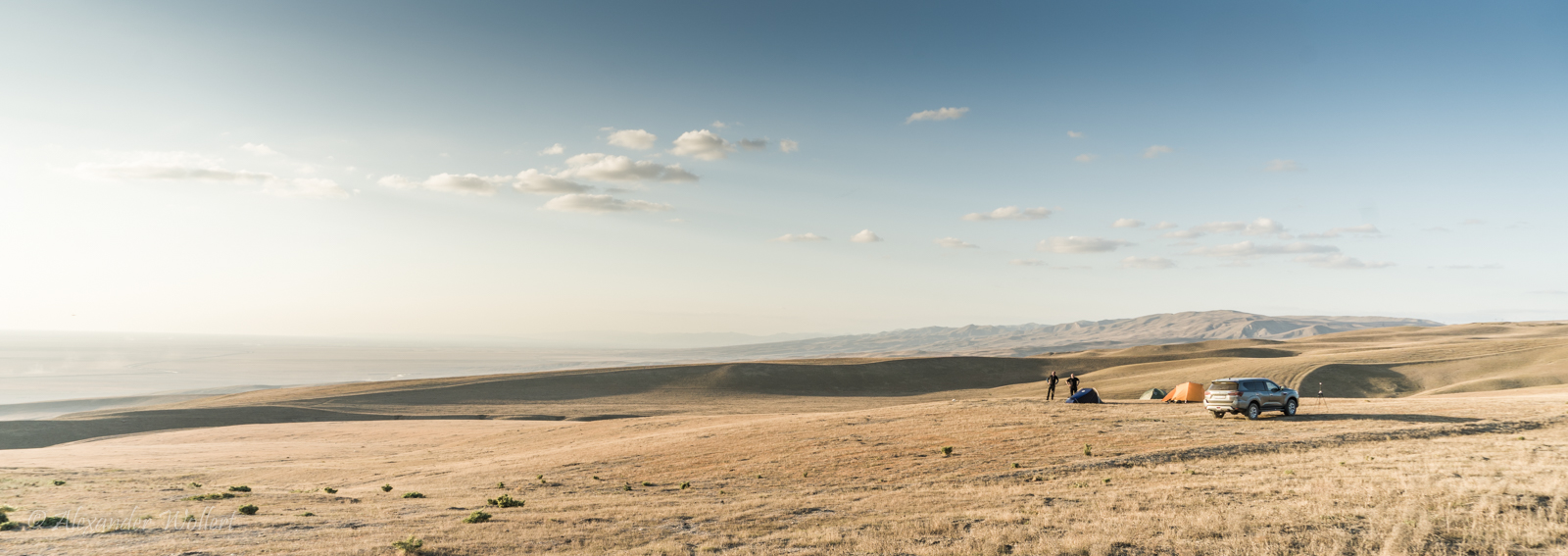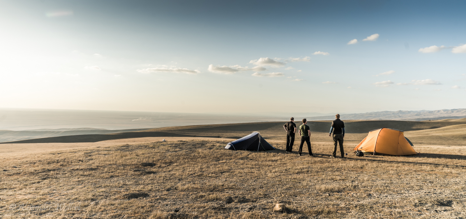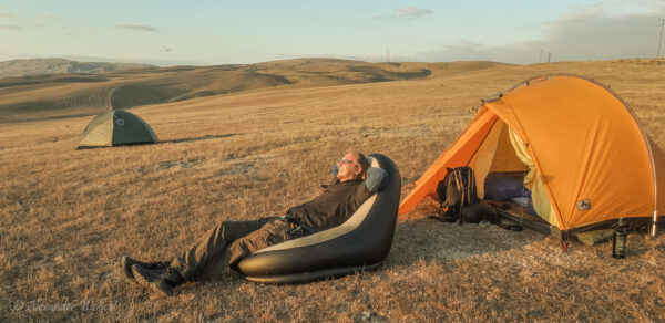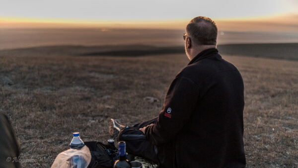 We pick out a hill and I steer the off-road vehicle across the barren ground, which offers an ideal spot for our tents. We quickly set them up and settle in with some slices of salami and Robert’s bottle of wine.